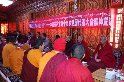 宣講團(tuán)成員勇勇用藏語激情洋溢的宣講黨的十九大精神,現(xiàn)場(chǎng)不斷響起熱烈的掌聲。當(dāng)勇勇講到我國(guó)五年來取得的輝煌成就時(shí),僧人們都激動(dòng)不已,紛紛為發(fā)展成就點(diǎn)贊。“聽了今天的宣講,我進(jìn)一步了解到了我們國(guó)家這些年來取得的發(fā)展成就。一直以來,黨對(duì)我們的關(guān)懷是看得見摸得著的,現(xiàn)在我們的寺廟管理越來越規(guī)范,基礎(chǔ)設(shè)施也得到了完善,通往寺廟的道路也有了明顯改善,我們的生活越來越好了,這一切都是共產(chǎn)黨的功勞?!彼聫R僧人尺乃表達(dá)著對(duì)黨的感恩。