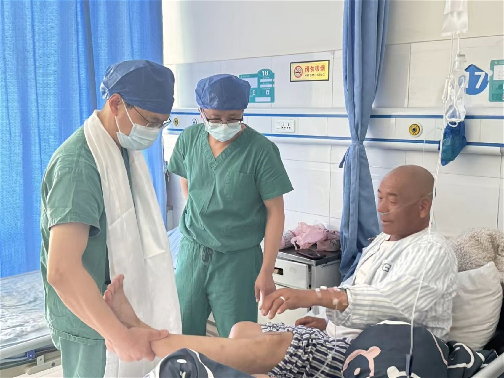 病房里,“昨天接到可以手術(shù)的電話一家人都非常開心!”膝蓋的問題困擾了李秀文十多年,“媽媽怕路程遠,總覺得能忍,但今年疼痛更加明顯,本來打算年底去治療的,但沒想到,這次義診解決了我們的困擾?!崩钚阄牡膬鹤影翝赡苏f,在家門口就有北京的專家坐診看病,他真是沒想到。
