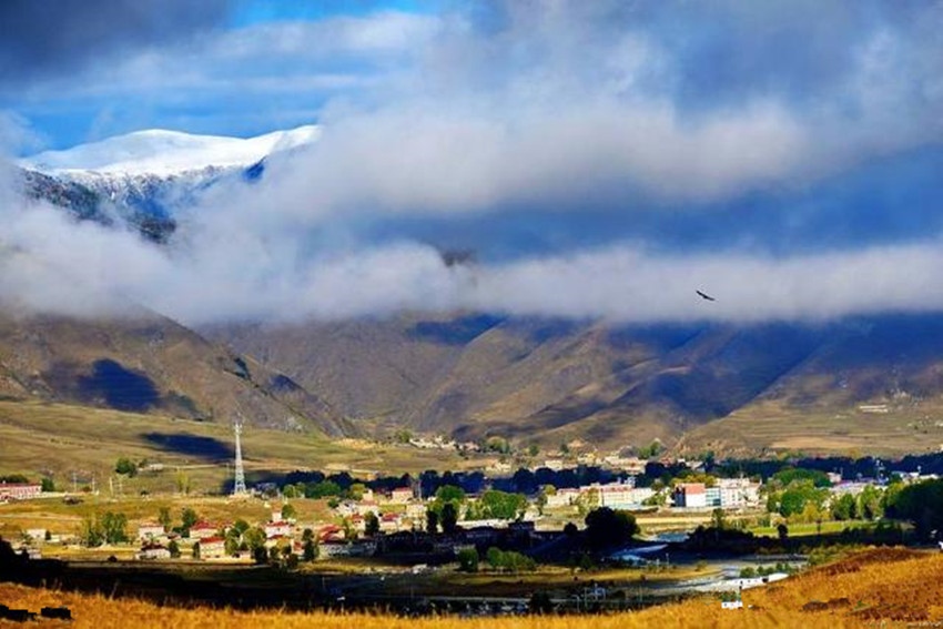 “跑馬溜溜的山上,一朵溜溜的云喲。?!币磺刀ㄇ楦枋沟门荞R山揚(yáng)名世界??刀h城周?chē)腥江h(huán)繞,其中之一就是跑馬山。跑馬山,藏名:拉姆則,意為:仙女山。因山頂有湖泊五色海,故又名:五色海子山。
