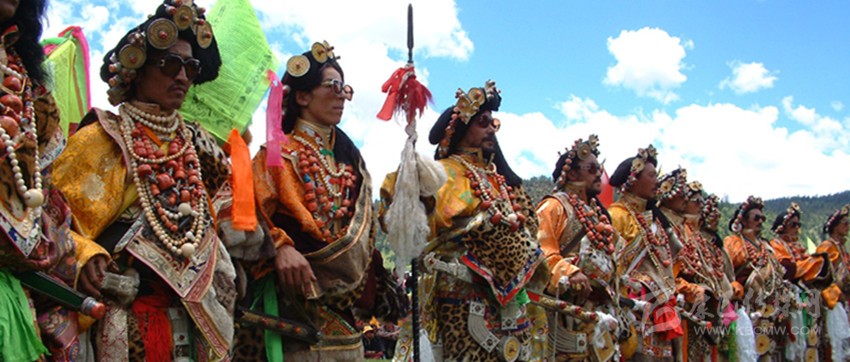 同時,因為康巴藏區(qū)雪峰林立,氣候寒冷。以號稱地球第三極地聞名遐邇??蛋腿嗣袷朗来驮谶@世界屋脊上過著“逐水草而居”的游牧和半牧半農(nóng)的生活。因而在服飾上也形成了具有典型的雪域高原民族獨有的地方風(fēng)格特色??傮w呈現(xiàn)出寬大粗獷、英武健美、豪氣颯爽的特點和大襟、寬腰、長袖、超長、無扣的特征。而色彩是康巴藏族服飾點綴美的靈魂,他們在色彩運用上十分著重色塊與整體的相襯與和諧,其運用最多的紅、黃、藍、綠、白、黑,往往包含了宗教的象征意蘊,又歸納了雪域大自然所呈現(xiàn)的直觀表征:他們認為藍、白、綠、紅、黃五彩是菩薩的服裝,藍色代表藍天,白色表示白云,綠色表示河流,紅色表示空間護法神,黃色表示大地。這是康巴人貼近自然的感恩之情和神性世界的精神延續(xù)的又一直接表達。