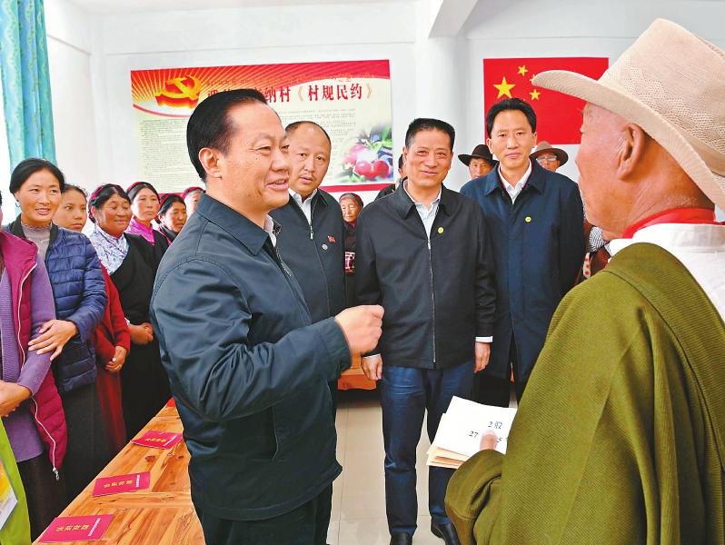 在村民澤翁家中,彭清華細(xì)致察看整修后的旅游民宿,了解房屋結(jié)構(gòu)功能、抗震設(shè)防標(biāo)準(zhǔn)和修建費(fèi)用等,與一家人拉家常、聊增收,鼓勵(lì)他們?cè)俳釉賲?,把日子越過(guò)越好。雅德鄉(xiāng)交納村平均海拔3300米,是典型的高原藏區(qū)貧困村。彭清華沿著崎嶇的山路步行來(lái)到貧困戶亞瑪忠登和根呷家中,與他們圍坐在一起,共同分析致貧原因和脫貧進(jìn)展,詳細(xì)了解各項(xiàng)幫扶措施落實(shí)情況,為他們脫貧增收鼓勁支招。在交納村村委會(huì)辦公室,彭清華與在這里參加合作社入股分紅活動(dòng)的村民們親切交談。他對(duì)在場(chǎng)的村干部和鄉(xiāng)親們說(shuō),習(xí)近平總書記、黨中央十分牽掛藏區(qū)群眾,對(duì)扎實(shí)做好藏區(qū)經(jīng)濟(jì)發(fā)展、民生改善和社會(huì)和諧穩(wěn)定特別是脫貧攻堅(jiān)等方面工作作出一系列重要指示、提出明確要求。我們要認(rèn)真學(xué)習(xí)領(lǐng)會(huì)、堅(jiān)決貫徹落實(shí)。希望鄉(xiāng)親們始終銘記習(xí)近平總書記的深切關(guān)懷,進(jìn)一步堅(jiān)定脫貧信心,大力發(fā)展生產(chǎn),積極學(xué)習(xí)技術(shù),尤其要重視孩子們的培養(yǎng)教育,讓適齡少年兒童都能接受義務(wù)教育,堅(jiān)決阻斷貧困代際傳遞。要充分發(fā)揮群眾的積極性和主動(dòng)性,引導(dǎo)村民依靠自己的辛勤勞動(dòng)拔窮根、摘窮帽,早日脫貧致富奔小康。