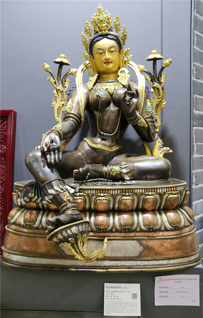 本網(wǎng)訊(記者 宋志勇 文/圖)“這是由什么材料鑄成的物件?”“這件作品的寓意是什么?”“這是一件花色青銅《綠度母佛像》,分別由金、銀、銅鑄成,高100cm、寬50cm,綠度母為觀世音菩薩的化身。”5月12日是第十四屆中國(深圳)國際文化產(chǎn)業(yè)博覽交易會第三天,甘孜展館迎來了眾多參觀者,在館內(nèi)市民正與白玉縣董察文化發(fā)展有限責(zé)任公司董事長日多一問一答。