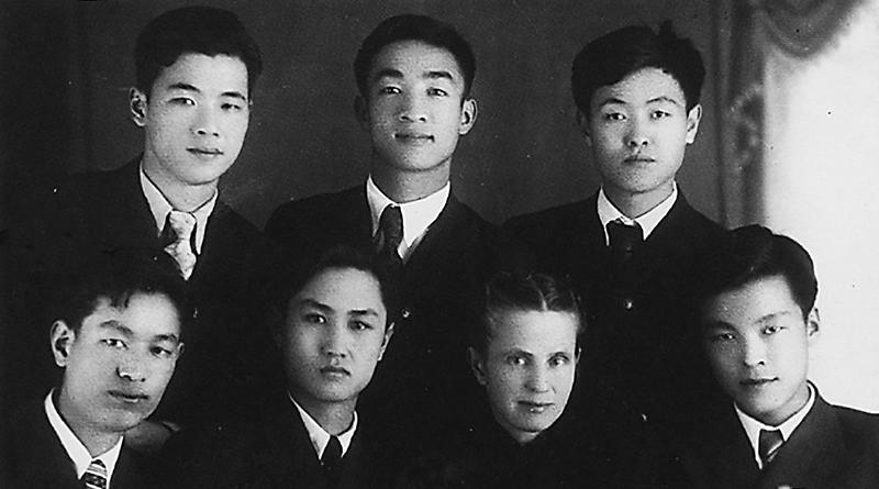 1949 年 6月1日,李鵬同志(后排左)在蘇聯(lián)伊萬諾沃動力學(xué)院補(bǔ)習(xí)數(shù)理化及俄文時與俄語教師費(fèi)德洛娃(前排左三)及同學(xué)合影。 新華社發(fā)