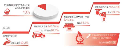 發(fā)展壯大戰(zhàn)略性新興產(chǎn)業(yè)。“戰(zhàn)略性新興產(chǎn)業(yè)具有創(chuàng)新活躍、技術(shù)密集等特點(diǎn),為新質(zhì)生產(chǎn)力發(fā)展壯大提供了巨大空間。”高文代表說,近年來,我國戰(zhàn)略性新興產(chǎn)業(yè)蓬勃發(fā)展,目前戰(zhàn)略性新興產(chǎn)業(yè)占GDP比重約13%。