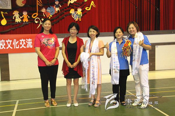 ▲巴塘縣委常委、宣傳部長張平樹,巴塘縣政府副縣長王文英向臺中市北區(qū)太平小學(xué)回贈哈達和吉祥結(jié)。