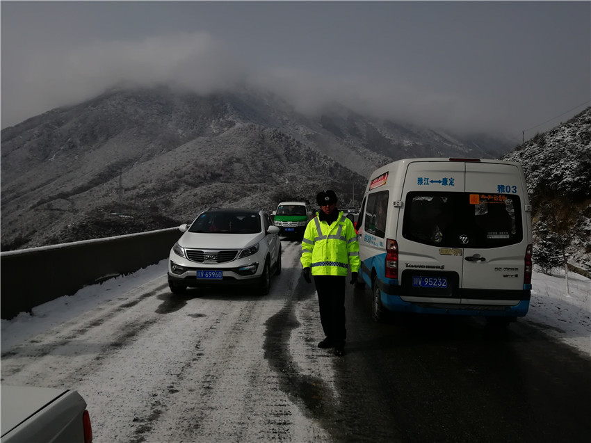 王洛讓和同事是看老天爺“臉色”工作,老天爺一“變臉”,就是王洛讓和同事最忙碌的時(shí)候。2013年9月,折多山下了一天一夜的雪,積雪深至膝蓋,道路中斷無法通行。為了除雪搶險(xiǎn)和疏導(dǎo)交通,王洛讓和同事們?cè)谡鄱嗌缴媳甲?天3夜,在冰冷的雪地上幫助過往司機(jī)掛防滑鏈、攙扶有高原反應(yīng)的游客、為堵車的駕駛員送上熱水,免費(fèi)為游客提供高原應(yīng)急藥品。