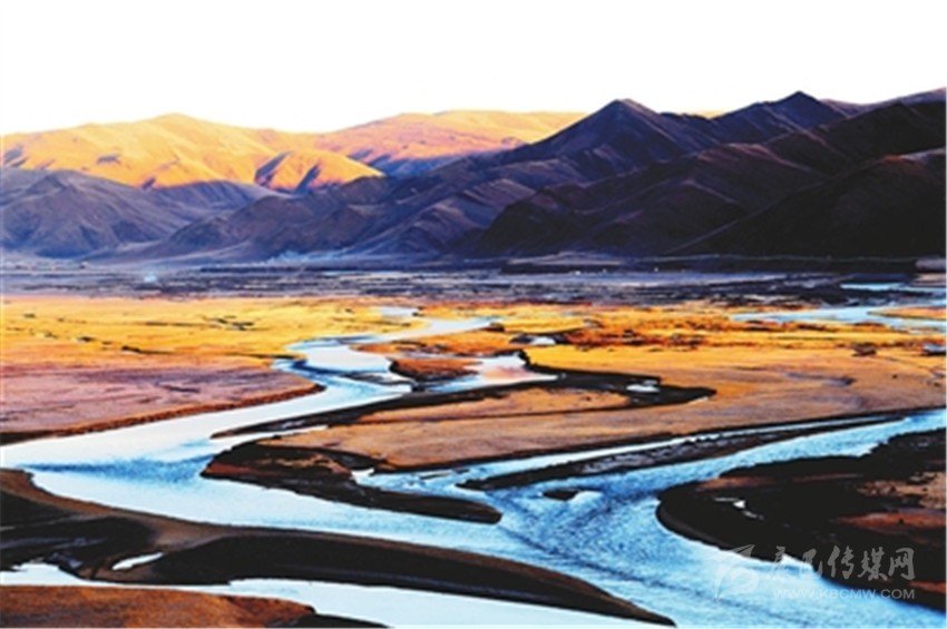 扎溪卡大草原朝霞映襯下的雅礱江源頭。 新華社記者 陳天湖 攝