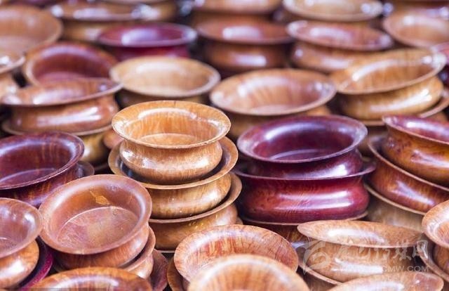 按藏族傳統(tǒng),一般人使用得最多的餐具是木碗。木碗一般用樺木、雜木雕琢而成,質地結實,不易破裂,花紋細膩,較為美觀。木碗的制作過程,一是選材,二是風干,三是制坯,四是細磨,五是上色。藏族木碗可分為大碗、小碗、蓋碗、套碗、木缽等多種,用途廣泛,可供喝茶,吃糌粑,存放食品、香料、佐料等,而且還具有光滑、細致、美觀、適用、不變味、喝茶香、攜帶方便等特點。雜木碗還有防毒的優(yōu)點。至于純金、純銀做成的勺子、筷子、碗和盤,雖然在民間也能見到,但畢竟不是被普遍使用的生活用品,一般給客人奉茶都使用瓷碗。