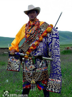 吐蕃時期   藏族服飾文化有了較大的發(fā)展。"中二丁王"時(相當(dāng)于中原西漢中期),南方雅隆河谷的吐蕃開始了冶煉鐵、銅、銀等礦產(chǎn),為金屬飾品的出現(xiàn)創(chuàng)造了條件。藏史記載,公元三世紀(jì)的拉妥妥日年贊時,吐蕃贊普的服飾巳與眾不同,出現(xiàn)了服飾等級的差異。史載松贊干布時期,吐蕃的歷史翻開了新的一頁,吐蕃文化得到迅速的發(fā)展,其服飾文化日漸發(fā)達(dá)。吐蕃奴隸制王朝等級森嚴(yán),在服飾上的表現(xiàn)也日臻完備。從反映吐蕃盛時的敦煌壁畫可看出,君臣服飾的等級差異,藏王一般只有贊普才能使用的三瓣寶冠箍住的有凹槽裝飾的無沿帽,呈紅色,通常高于一般人的帽子;藏王的侍從或臣下往往戴平頂無沿帽。衣袍的式樣也各有不同,官吏的章飾規(guī)定有一等瑟瑟,二等金,三等金包銀,四等銀,五等銅,六等鐵等大小兩類,共十二級,裝在方圓三寸的盒子里掛在胸前,以區(qū)別職位的高低。武將的頭盔有形如塔的裝飾,戰(zhàn)士頭盔上有三只彩旗以表示出生的年月,隨著"惟以淬礪為業(yè)"的吐蕃冶煉業(yè)的發(fā)展,軍隊(duì)的鎧胄日趨精良,有的周身僅露兩個眼窩,勁弓利刃常不能破,其威嚴(yán)、勇猛之氣在今天大昭寺壁畫的吐蕃武士像中尚歷歷在目。吐蕃貴族不僅本人穿著華貴,還在聚會宴客時,把傭人裝飾起來。而作為贊普的松贊干布則用一種紅帶子包頭,身著長袍,足穿腳尖朝上的靴子,據(jù)《紅史》載,這種王服是受波斯王朝的影響,反映了文化交往已影響到了服飾文化層次,而從松贊干布伊始的吐蕃與中原的密切交往,兩種民族文化的長期接觸更為藏族服飾的發(fā)展注入了新鮮血液。史載文成公主進(jìn)藏時,帶入諸種花緞、錦、綾羅與諸色衣料二萬匹,還有大量的金玉器具。松贊干布及吐蕃大臣紛紛自行去掉氈裘,改穿絹綺。近代西藏的高級官吏,頭發(fā)綰成一髻,戴金翅白紗帽,這是唐代進(jìn)士的服飾。此外,還采納文成公主建議,令國人禁止"赭面"(用油涂面),文成公主進(jìn)藏還帶來了種植蠶桑和紡織技術(shù),"植桑織絲兮"大大的促進(jìn)了吐蕃服飾技藝的發(fā)展,青海海西州都蘭出土的大批吐蕃服飾文物,真實(shí)、生動地反映了吐蕃服飾的工藝水平。服裝的織物紋樣多為聯(lián)珠動物紋,裝飾品的金質(zhì)首飾、佩飾的精美使人嘆為觀止。今天藏族婦女飾品的鑲嵌形制,可以從這些文物中找到原型。斯坦因的《古代中亞文化遺跡》一書也曾提到:"在吐蕃發(fā)現(xiàn)的遺物中,有很多具有花紋的絲織物,花紋中有些是印的,有些是織的,花紋圖象的變化很多,這一點(diǎn)很可以表示吐蕃商業(yè)的地位,……大概是中國與西亞之間的貿(mào)易重點(diǎn)。"頻繁的交往促進(jìn)了吐蕃經(jīng)濟(jì)的發(fā)展,也促進(jìn)了服飾文化的發(fā)展。 吐蕃是一個軍事帝國,在它的發(fā)展過程中征服融合了青藏高原及其邊緣地區(qū)的許多其他民族,這是造成今天各地區(qū)藏族之間文化差異的重要原因。在服飾的表現(xiàn)上也是如此。吐蕃時代這種差異主要表現(xiàn)為東女、附國、黨項(xiàng)等部落服飾的不同,東女部落住在康延川(今昌都),處于母系氏族社會發(fā)展階段,其女王穿青毛綾(氆氌)裙,上披青袍,袖長到地,冬穿用文錦裝飾的羔裘。發(fā)作鬟髻狀,兩耳垂珰(耳環(huán))。足穿革素(皮靴)。一般男子披發(fā),婦女辨發(fā),男女都用彩色涂面。王死居喪三年,不易服,不梳洗。附國是以今四川甘孜為中心,包括今四川阿壩一帶的嘉絨藏人的藏羌融合體。他們頭戴圓形皮帽,或帶幕離佳(即面罩一類飾物,為婦女所帶)。身披毛曷毛(氆氌一類)、皮裘,穿牛皮鞋。頸系鐵索,手貫鐵釧。王與酋長以金為首飾,胸前掛著三寸長的金花。黨項(xiàng)則是純游牧部落,"服氈襲褐,披氈以為上飾",早在北周時巳能制造精美的犀甲、鐵鎧。四川西北部還有屬黨項(xiàng)部落聯(lián)盟的鄧至、武興國和宕昌等,服飾習(xí)俗為頭藏烏皂突騎帽,身穿長袍,下著小口褲、足穿皮靴,與今四川牧區(qū)藏族服飾相似。此外青海地區(qū)有吐谷渾,貴婦人披錦袍,戴金花冠。如女發(fā)型為辨發(fā)披于后,后飾珠貝,以繁多為高貴,這一服飾與今青海藏族婦女大致相同。這些地區(qū)服飾特征是今天各地不同藏族服飾的母型。 吐蕃王朝崩潰后,從九世紀(jì)中期到第十一世紀(jì)的二百余年間,西藏社會一直處于分裂割據(jù)的混亂狀況。這一時期戰(zhàn)亂不堪,服飾藝術(shù)的發(fā)展也難免厄運(yùn),停滯不前,而與戰(zhàn)爭有關(guān)的武士服飾卻濟(jì)時發(fā)展。在西藏阿里古格王國的遺址中,發(fā)掘有大量古代武士的盔甲和武器。其鎧甲多為鋼片甲,是用細(xì)皮條串結(jié)鋼片而成,串結(jié)方法頗為復(fù)雜,武器中的盾牌,系用藤條編織為圓形,直徑八十厘米,正面鑲有銅質(zhì)加固件,銅件上雕刻有細(xì)密的紋飾,故亦可謂是銅飾件,背面有四個銅環(huán),環(huán)間可用皮條相連,作握柄之用,無論這些服飾和兵器,是西藏本地生產(chǎn),還是外來流入,都說明其時西藏的武士服飾已具鮮明的本土特征與個性。 佛教僧侶服飾興起  這一時期的服飾發(fā)展還有一個特點(diǎn)就是佛教僧侶服飾的興起。公元八世紀(jì),西藏出現(xiàn)了第一批僧人,服飾由贊普府庫供給,后由百姓、政府共同供養(yǎng)。佛教服飾亦形